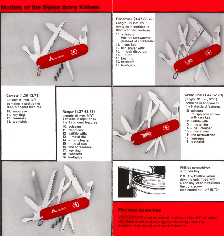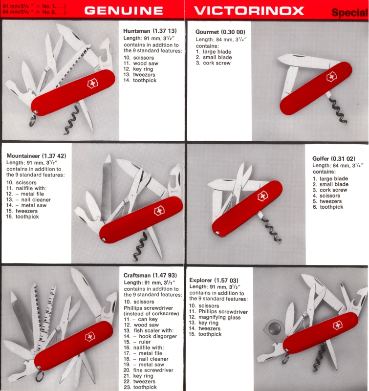 Scanned images from a Victorinox product brochure/catalog estimated to be from the 1970s. Source material provided by Dan Jacquart, scan by ICanFixThat(SOSAK). Alternate catalog source material and scan by ICanFixThat.