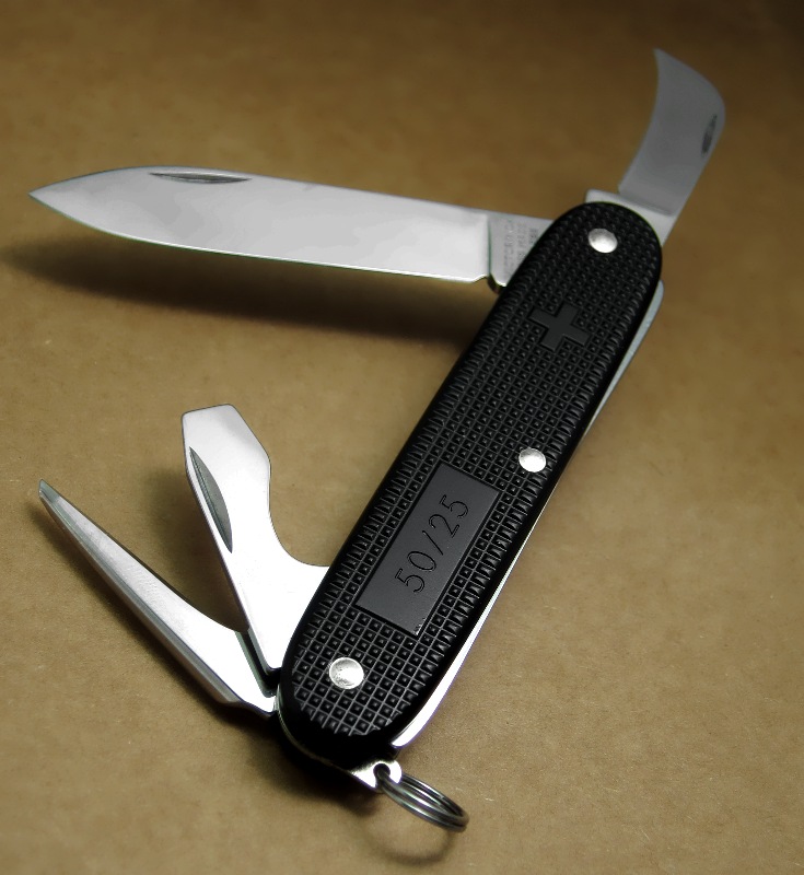 - In May 2011 Victorinox produced a limited numbered edition with black Alox scales and black Swiss cross. The number was stamped (50/nn) in the engraving panel on the top scale.