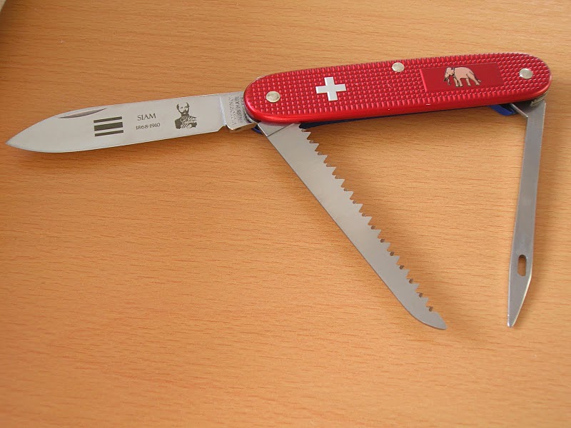 1. SIAM commemorative knife was produced in March 2011 for collectors in Thailand. This model is bi-color featuring a dark-red top-scale, and a blue bottom scale. The top scale is the old advertising style with a large silver Swiss cross, and an light copper toned elephant illustration outlined in black in the printing panel. The blades are stamped with a serial number from the run (50/n) on the reverse side (centered); only 50 knives were made.