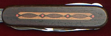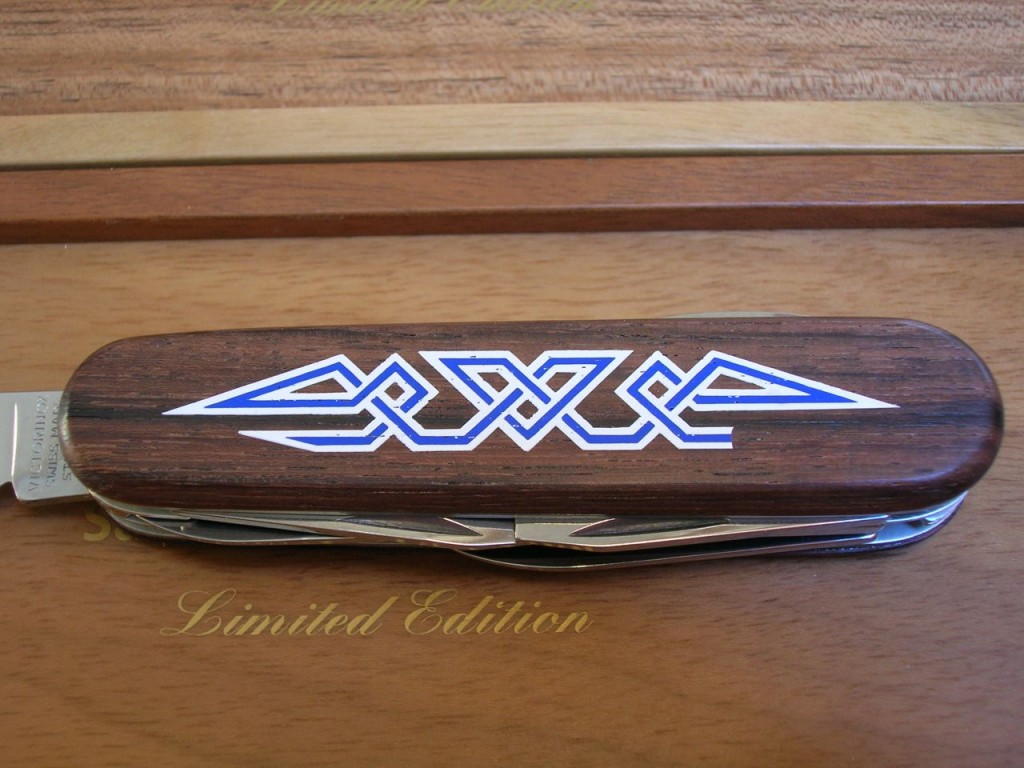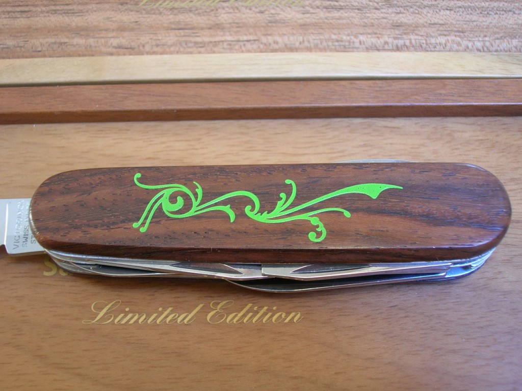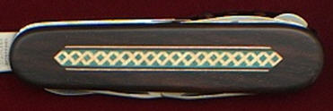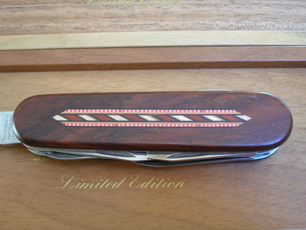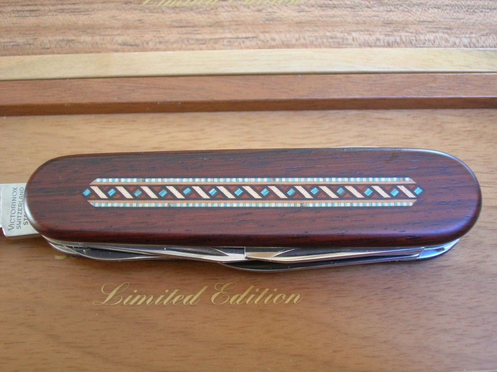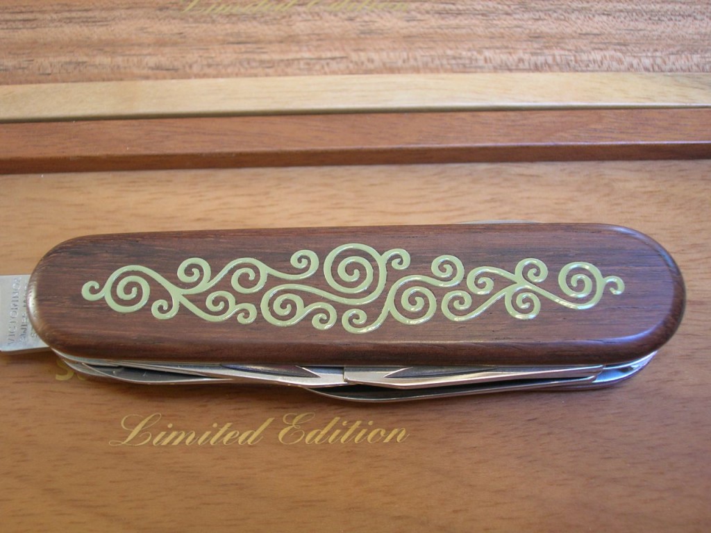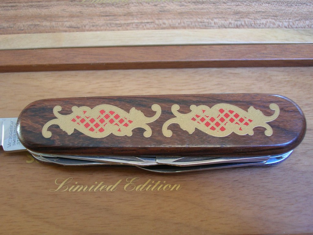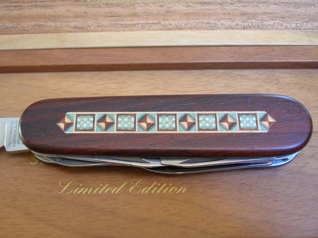 The rosewood front scale bears a stunning, delicate, coloured wood marquetry inlaid pattern. On some of the editions the reverse scales also carry the same marquetry. The Victorinox logo is printed on editions that do not have the reverse marquetry.