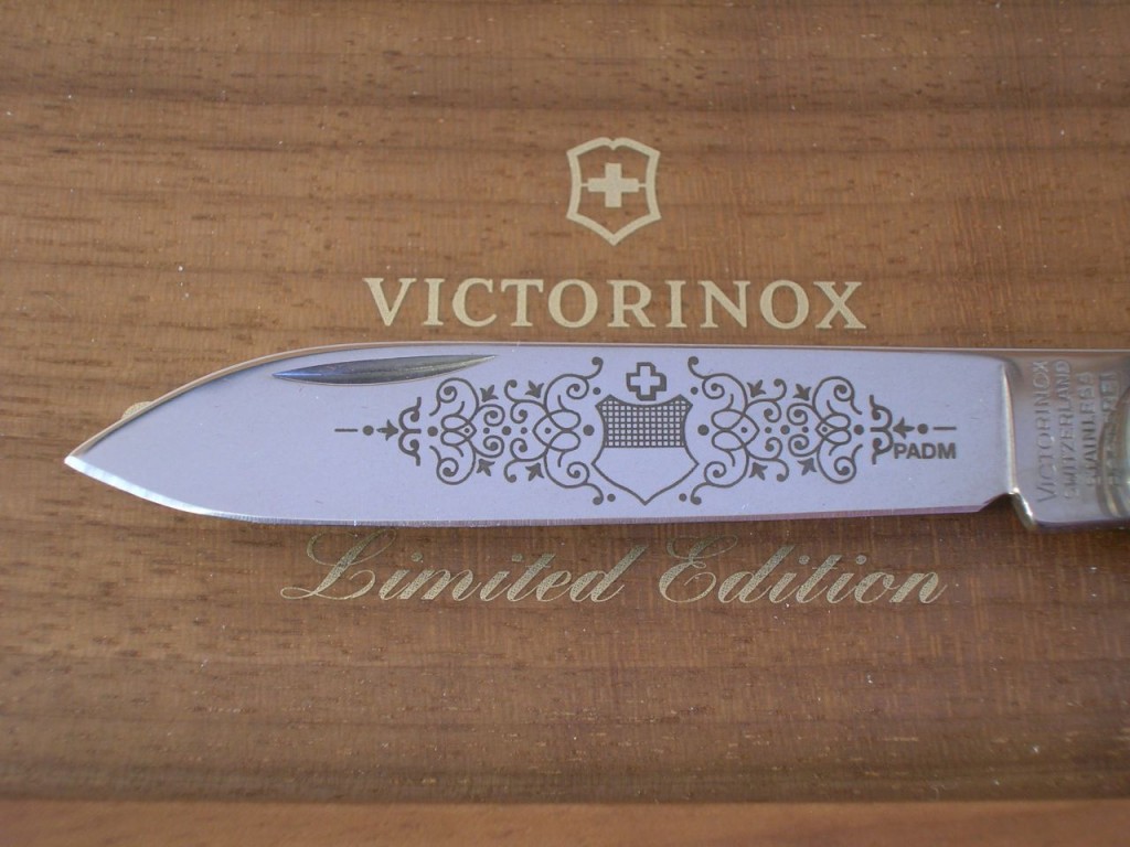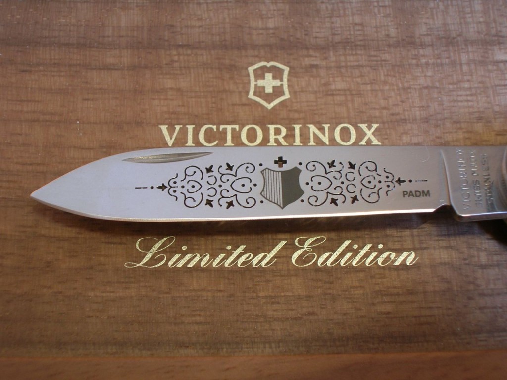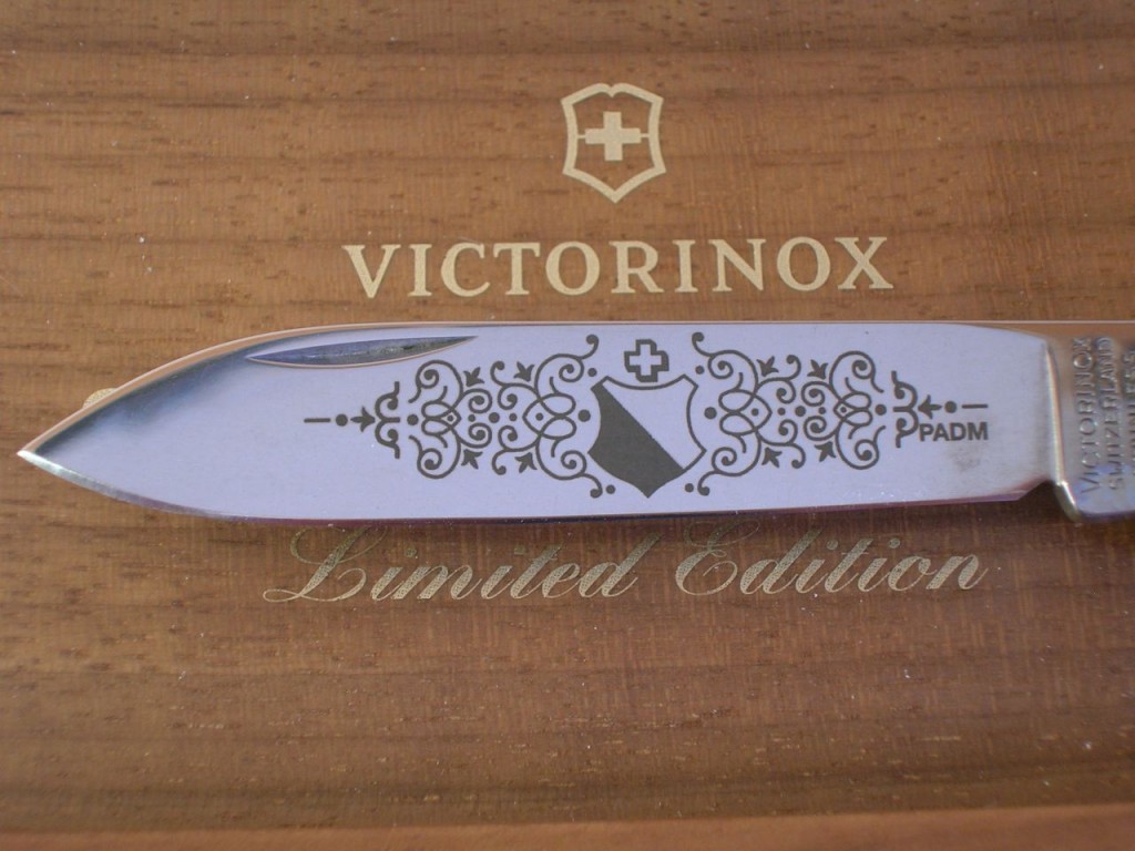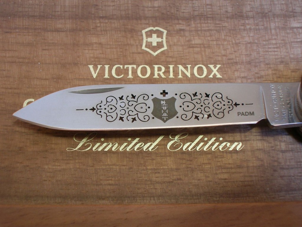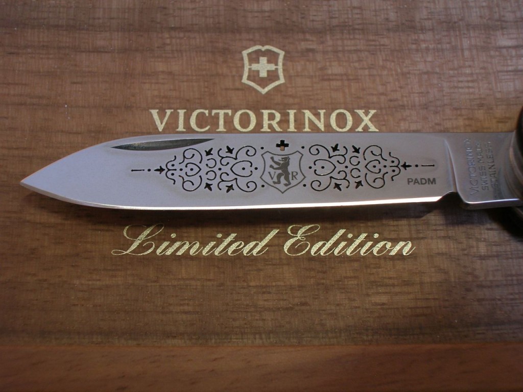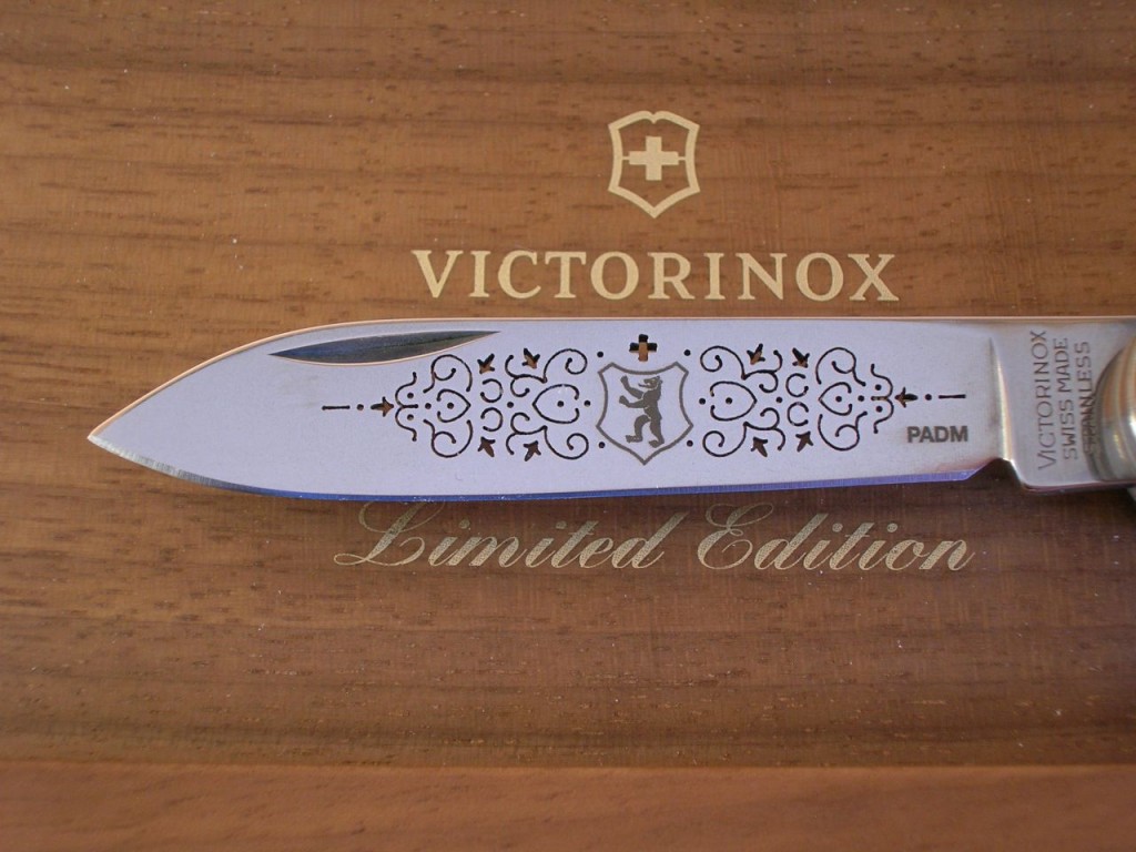 The etched entwined pattern is replaced with a laser cut completely through the blade and therefore the pattern is also visible on blade’s reverse side. The canton’s coat of arms is still etched on the front of the blade and the Victorinox logo is etched on the reverse.